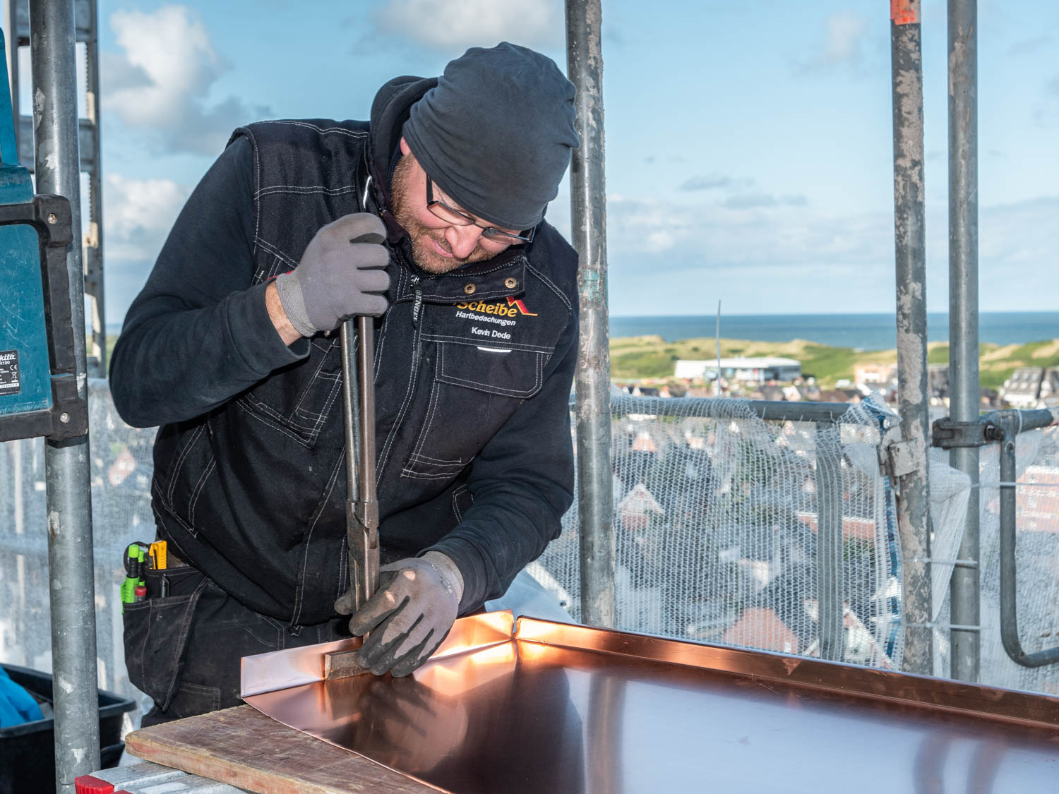 Kupfer ist ein Werkstoff mit einer langen Geschichte: Schon im Mittelalter war das Metall für seine Haltbarkeit und sein edles Aussehen bei Architekten besonders beliebt. So ziert es noch heute die Dächer zahlreicher historischer Gebäude wie Schlösser, Kathedralen – oder eben der Sylter Kirche, die bereits seit 1908 das Bild der Insel prägt und nun durch unsere Dachdecker ein neues Kupferdach erhalten hat.